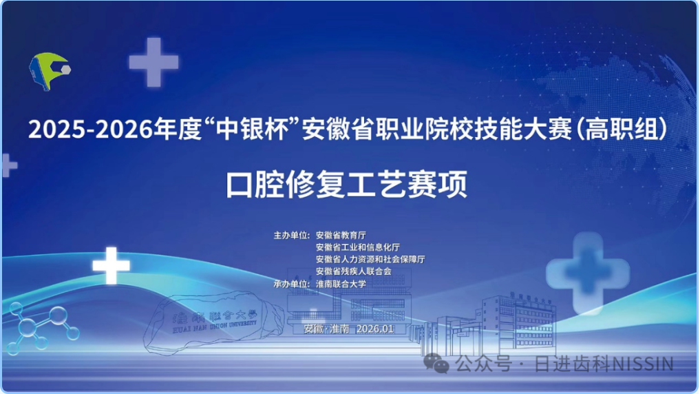由安徽省教育厅、安徽省工业与信息化厅、安徽省人力资源与社会保障厅、安徽省残疾人联合会主办,淮南联合大学承办,日进齿科材料(昆山)有限公司凯发网址的技术支持的2025-2026年度 “中银杯”安徽省职业院校技能大赛(高职组)口腔修复工艺技能赛项于2026年1月27日—29日在淮南举办。